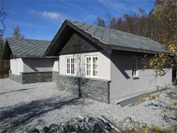 Hytte i 30 cm Leca isoblokk, pusset med fiberpuss. Deler av yttervegg er forblendet med skifer.